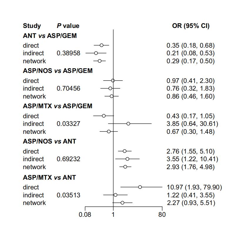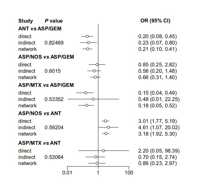 The assessment of the inconsistency of our findings was conducted through the utilization of the node-splitting method, along with Bayesian P value. In most cases, the CIs derived from direct and indirect evidence were largely congruent, albeit with minor discrepancies. However, notable disparities were detected in certain comparisons, thereby constraining the applicability of our results. Specifically, the comparison of ASP/MTX-based and ASP/GEM-based regimens in terms of their efficacy in achieving CR (P = 0.033), as well as the comparison of ASP/MTX-based and ANT-based regimens in this regard (P = 0.035), yielded similar outcomes (Supplementary Material 3, www.thejh.org). Nevertheless, it was observed that there was no significant distinction between direct and indirect evidence (Supplementary Materials 3-6, www.thejh.org).